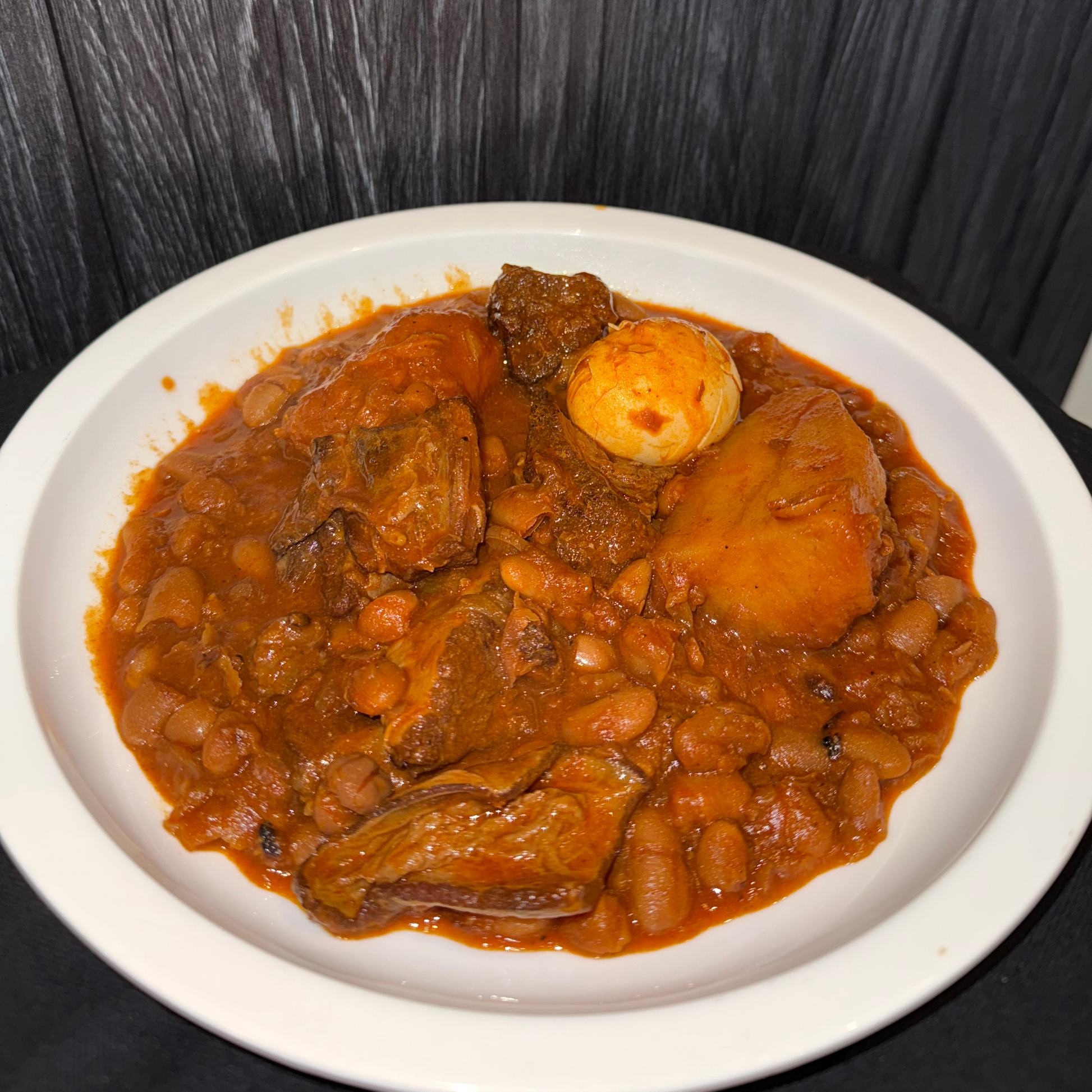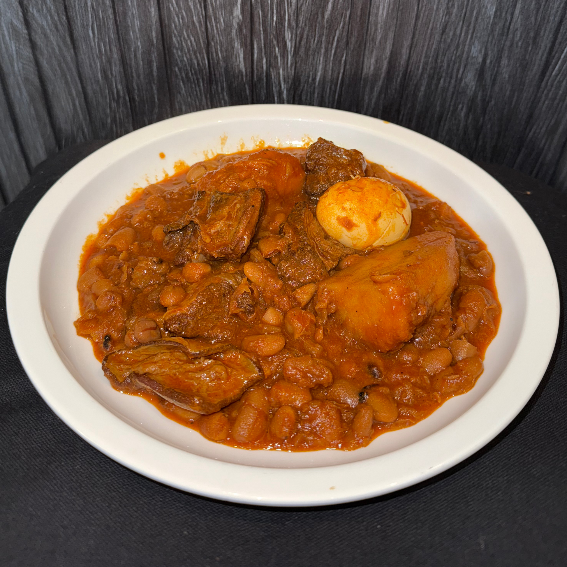 Traditional Shabbat Chamin – Slow-cooked beef short ribs with beans, chickpeas, barley, potatoes, and sweet potatoes