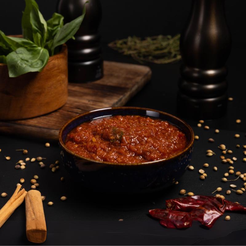 Roasted red peppers, tomatoes, and a blend of aromatic spices.