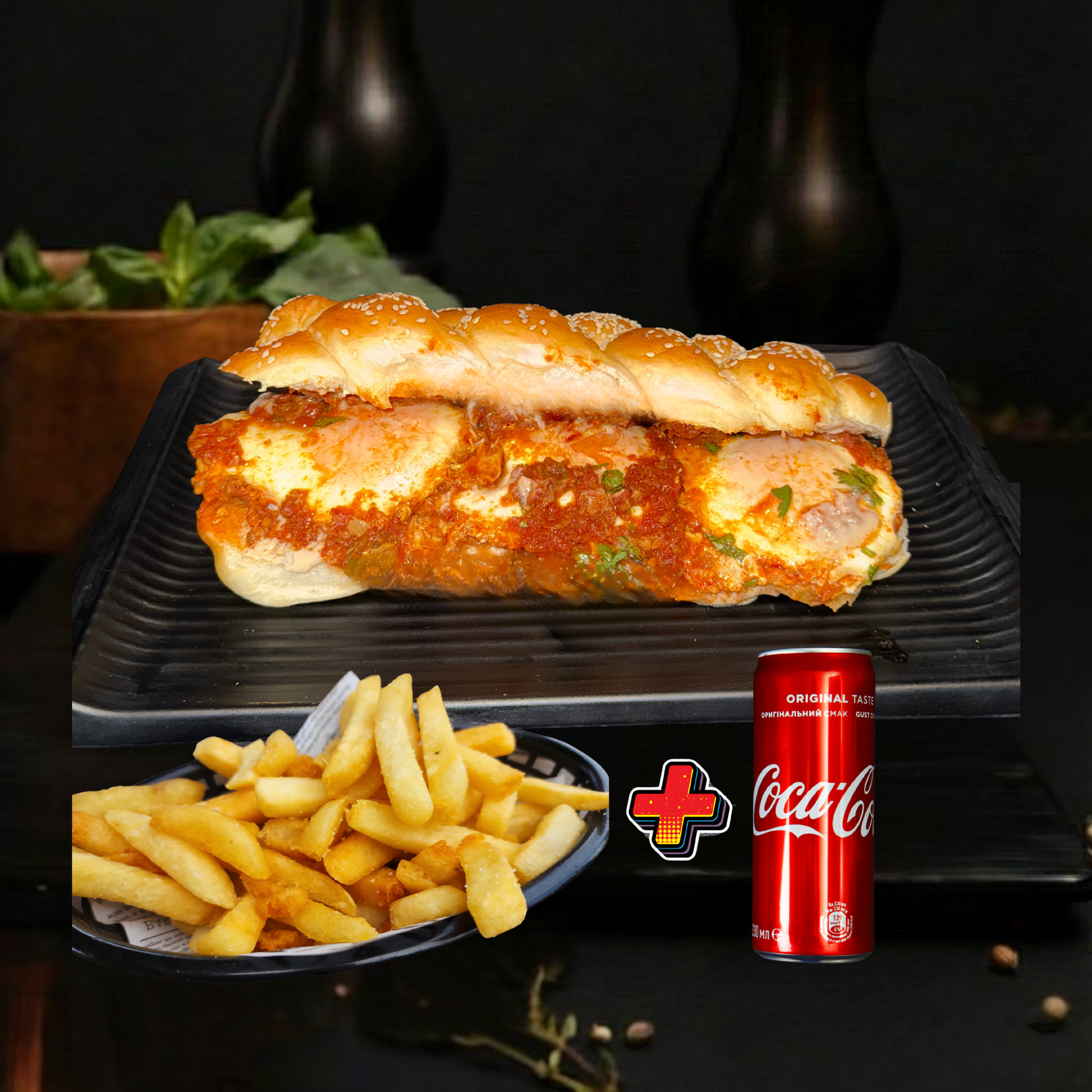 A freshly baked challah roll filled with rich, homemade shakshuka — a flavorful blend of tomatoes, peppers, and spices — wrapped in a warm and hearty embrace.